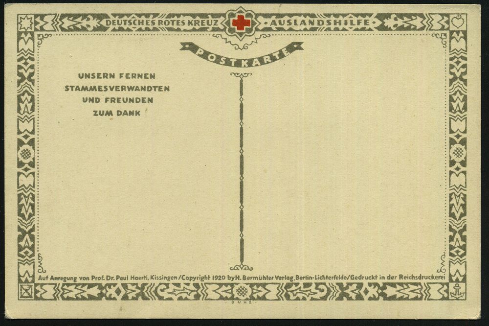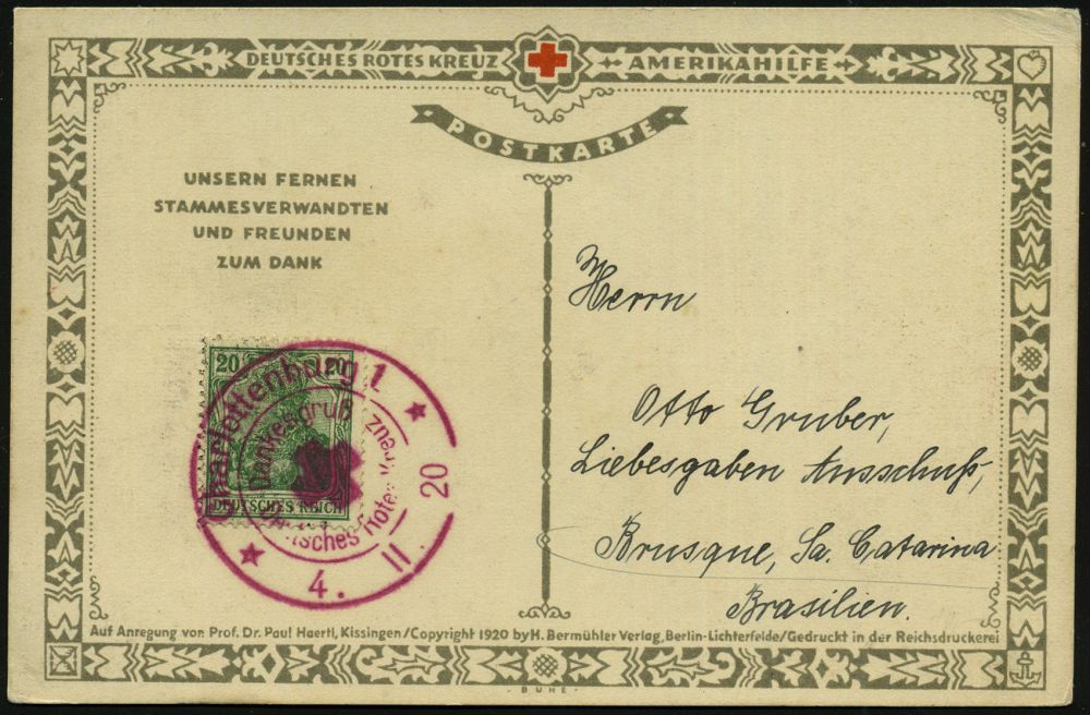 | 1021 | 40 € | WEIMARER REPUBLIK 1919 - 1932/33 : Berlin-Charlottenbg. 1920 (4.11.) seltener, rot-violetter SSt: Charlottenburg 1/Dankesgruß/ Deutsches Rotes Kreuz auf EF 20 Pf. Germania, grün (Mi.143,EF + 100.-EUR) Künstler-R.K.-Color-Sonder-Kt. "CHARITAS, Kinder-Amerikahilfe" von Hans Baluschek, oben Signatur: H B A L U S C H E K, seltene Bedarfs-Übersee-Kt. n. Brasilien = UNICEF-Vorläufer! (Bo.2) | | |