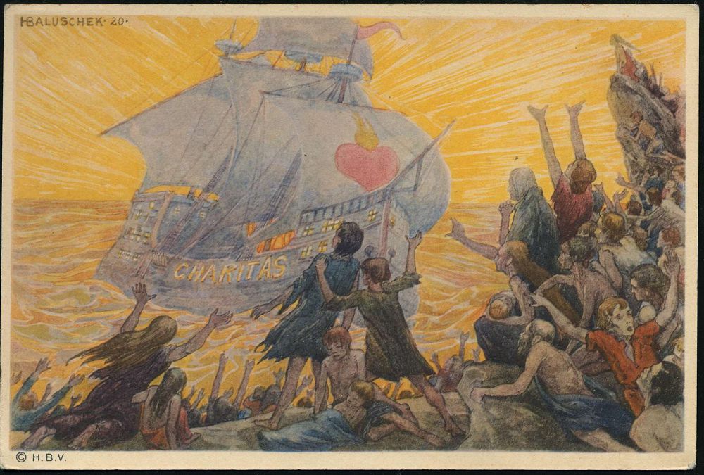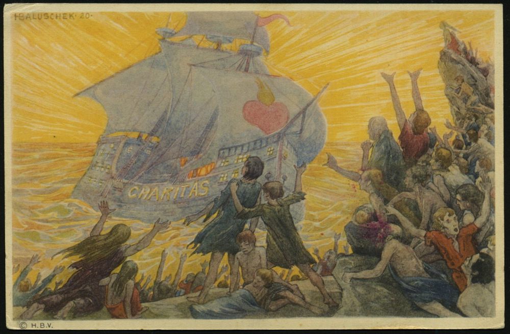 | 1020 | 20 € | WEIMARER REPUBLIK 1919 - 1932/33 : Berlin 1920 Color-Spenden-Künstler-Ak.: "CHARITAS" Rotkreuz-Auslandshilfe ("Caritas"-Kogge erreicht Küste der Elenden) von Hans B a l u s c h e k , Mitbegründer der "Berliner Sezession" (1870 - 1935), oben Signatur, ungebr., selten!, vergl. Los Nr. 1021 (gedruckt in der Reichsdruckerei!) | | |