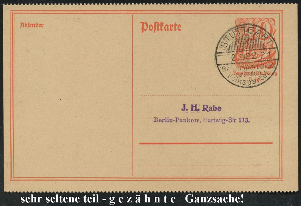 | 1140 | 50 € | WEIMARER REPUBLIK 1919 - 1932/33 : STUTTGART/ */ Reichsparteitag/ der Deutsch./ Volkspartei 1921 (2.12.) seltener SSt auf sehr seltener oben g e z ä h n t e r Inl.-P 40 Pf. Postreiter (Mi.P 141 II + 300.- EUR) klar gest. Inl.-Karte (o. Txt) n. Berlin (Bo.9) | | |
