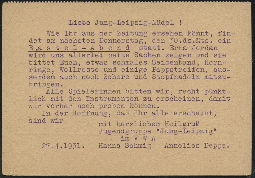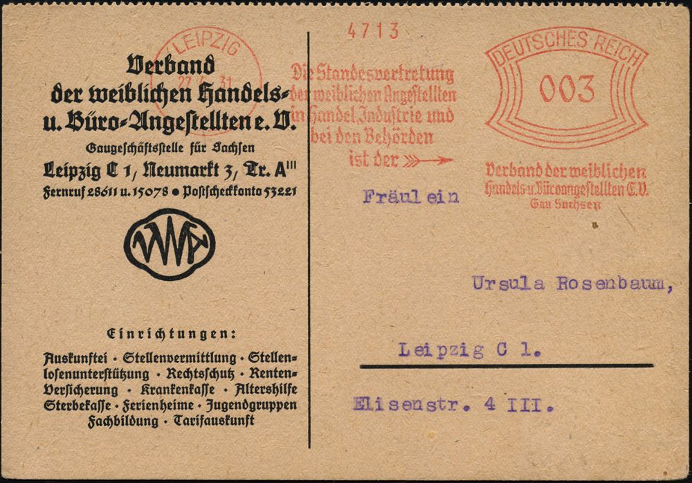 | 1119 | 20 € | WEIMARER REPUBLIK 1919 - 1932/33 : LEIPZIG/ C 1/ Die Standesvertretung/ d.weiblichen Angestellten../ Verband der weiblichen/ Handels-u.Büroangestellten E.V. 1931 (27.4.) seltener AFS Francotyp "Bogenrechteck" klar auf dekorativer Vordruck-Kt., rs. Text : Jugendgruppe "Jungleipzig" V W A, Verband wurde 1933 verboten bzw. in die DAF zwangsintegriert! (Dü.E-1CEh) | | |