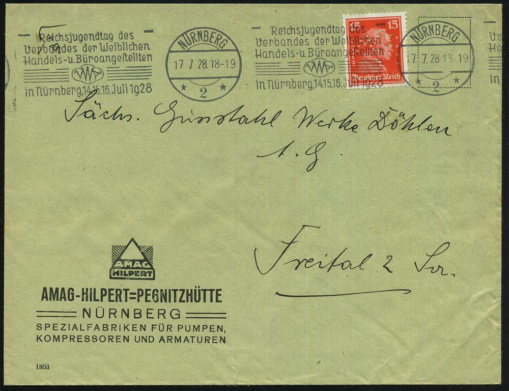 | 1134 | 18 € | WEIMARER REPUBLIK 1919 - 1932/33 : NÜRNBERG/ *2*/ Reichsjugendtag des/ Verbandes der Weiblichen/ Handels-u.Büroangestellten/ VWA.. 1928 (Juli) seltener Band-MWSt = Gewerkschaft V W A , klar gest. Firmen-Fernbf.: AMAG-HILPERT-PENITZHÜTTE (Bo.27 Bd II) | | |