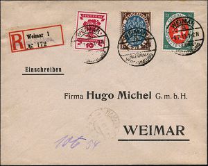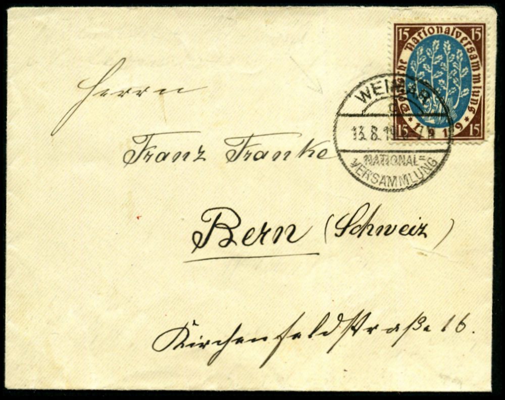 | 1150 | 35 € | WEIMARER REPUBLIK 1919 - 1932/33 : WEIMAR/ d/ NATIONAL=/ VERSAMMLUNG 1919 (4.7.) SSt mit UB "b" 4x auf Kurzsatz National-Vers. (Mi.107/09) + provis. Sonder-RZ: Weimar 1/ National/Versammlung /Weimar 1 (viol.2L o. UB, kl. Eckfehler) klar gest. Inl.-R-Bf. (Bo.2 d) | | |
