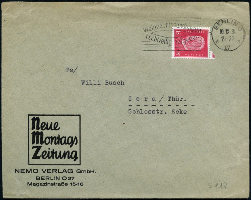 | 1063 | 18 € | WEIMARER REPUBLIK 1919 - 1932/33 : BERLIN O/ *17a/ Weihnachtssendungen/ rechtzeitig aufgeben 1931 (10.12.) MWSt auf Firmen-Bf.: Neue Montags Zeitung, NEMO VERLAG GmbH.. = Inhaber Willi Münzberg, KPD-naher Verleger , klar gest. Fern-Bf. (Bo.S 117 A) | | |