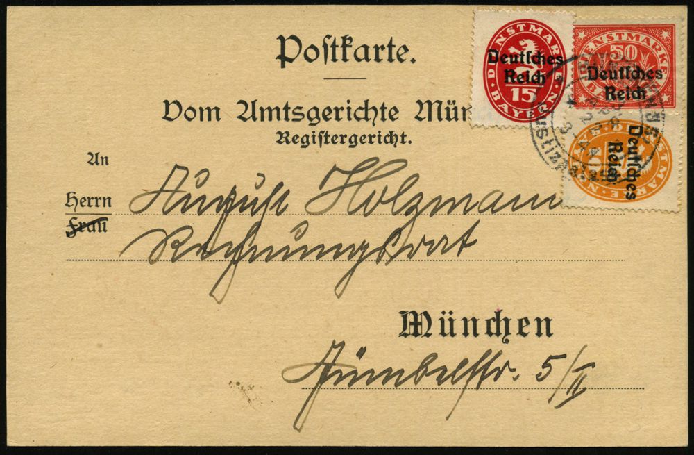 | 1130 | 16 € | WEIMARER REPUBLIK 1919 - 1932/33 : MÜNCHEN 35/ */ *a/ */ J u s t i z p a l a s t 1922 (13.4.) 2K = Hauspostamt auf 75 Pf.-Frankatur Dienst "Bayern Abschied", Dienst-Orts-Kt.: Registergericht, Genossenschaftssache + Farbkopie Justizpalast, vergl. Los Nr. 1131 (Mi.D 35/36, D 40) | | |