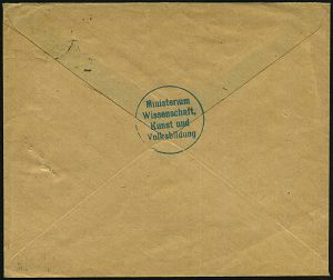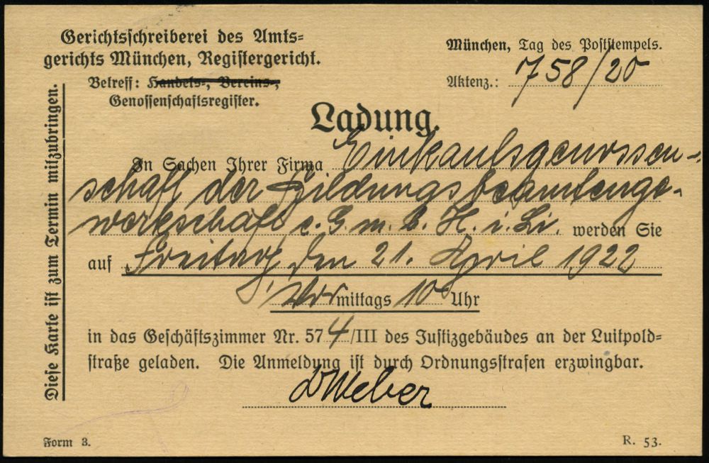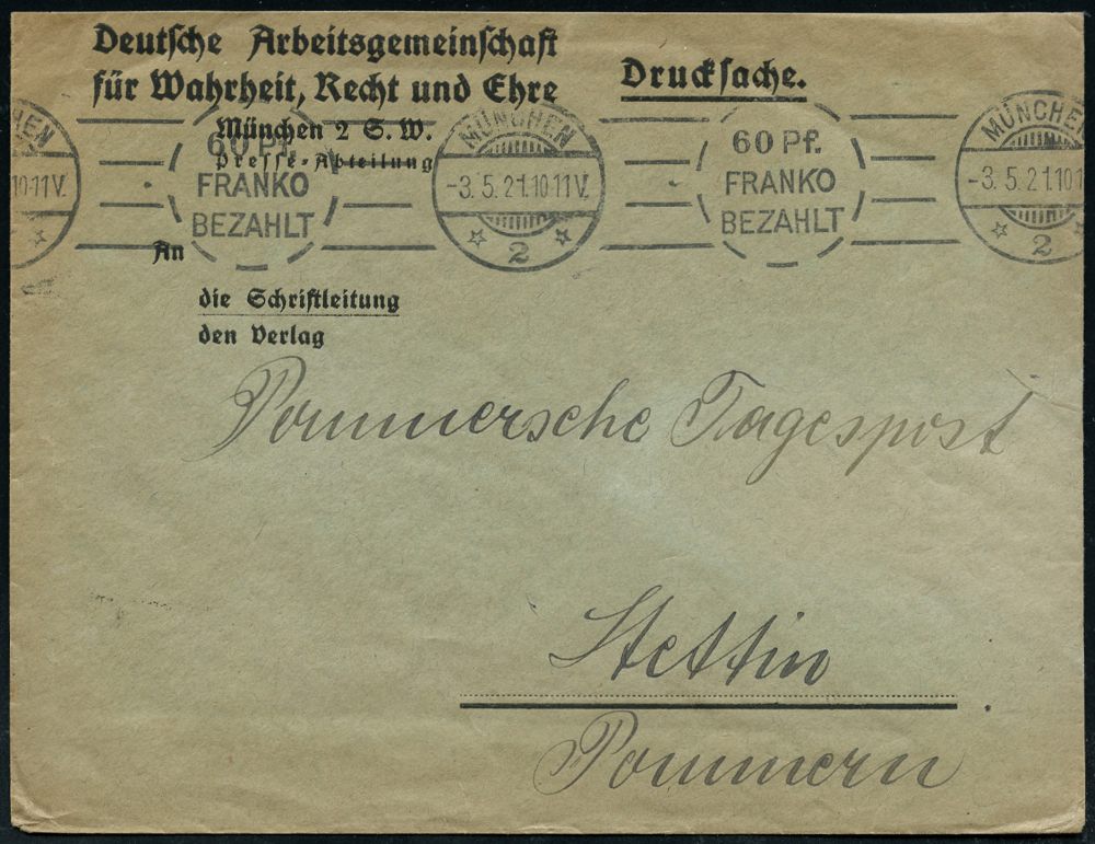 | 1127 | 20 € | WEIMARER REPUBLIK 1919 - 1932/33 : MÜNCHEN/ *2*/ FRANKO/ BEZAHLT 1921 (3.5.) schwarzer Band-PFS 60 Pf., Typ Sylbe auf Vordruck-Bf.: Deutsche Arbeitsgemeinschaft für Wahrheit, Recht u. Ehre n. Stettin (Dü.C-1, Nr.10 c) | | |