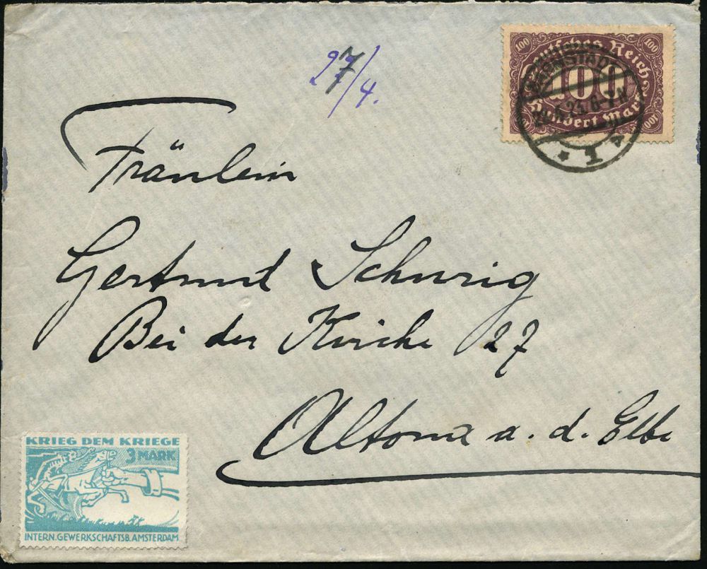| 1069 | 25 € | WEIMARER REPUBLIK 1919 - 1932/33 : DARMSTADT/ *1v 1923 (28.4.) 1K-Brücke auf 100 Mk. Ziffer + seltene, grüne Spendenmarke 3 MARK: "KRIEG DEM KRIEGE" INTERN. GEWERKSCHAFTSBUND AMSTERDAM = Arbeiterfaust stoppt apokalyptischen Reiter, klar gest. Fernbf. (Mi.247 EF) | | |