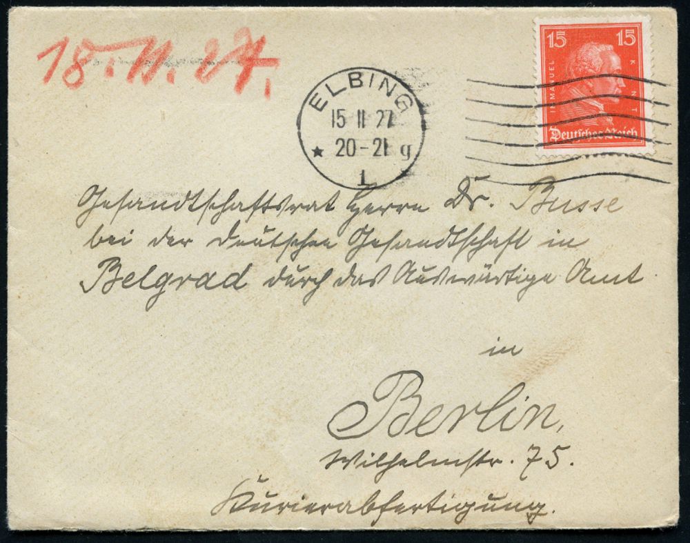 | 1083 | 20 € | WEIMARER REPUBLIK 1919 - 1932/33 : ELBING/ *1g 1927 (15.2.) MaWellenSt , EF 15 Pf. Kant = Inl.-Tarif auf Ausl.-Diplomaten-Bf. an Deutsche Boschaft, Belgrad , ab Berlin mit diplomat. Kurierpost!, hs. Adr.: "..durch Auswärtiges Amt in Berlin, Wilhelmstr. 75.." + Inhalt!, 2 Belege kompl.! (Mi.391) | | |