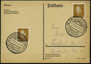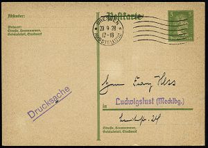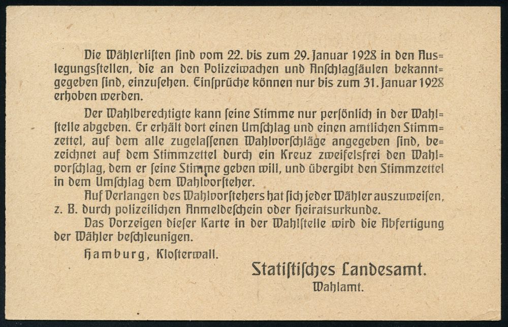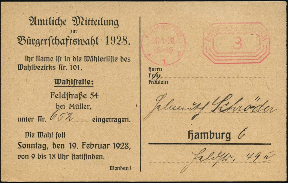 | 1096 | 16 € | WEIMARER REPUBLIK 1919 - 1932/33 : HAMBURG/ *1II 1928 (20.1.) PFS 3 Pf. auf Dienst-Kt.: Wahlamt, Statistisches Landesamt zur Bürgerschaftswahl 1928 = Wahlbenachrichtigungs-Kt. (Dü.D-4) | | |