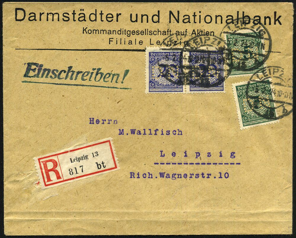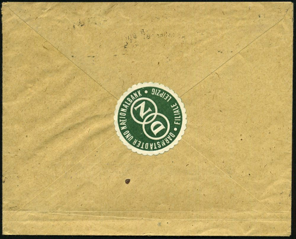 | 1116 | 18 € | WEIMARER REPUBLIK 1919 - 1932/33 : LEIPZIG/ *13b 1924 (5.2.) 1K-Brücke auf 2x 5 Pf. u. 2x 20 Pf. Korbdeckel, je Firmenlochung: "D N" = D armstädter u. Nationalbank + RZ: Leipzig 13/b t, (Bf. unten gefaltet) rs. dekorat. Siegeloblate, Orts-R-Bf., 1931 Konkurs der Bank in der Folge der Weltwirtschaftskrise 1929 (Mi.2x 339, 2x 341 Perfin) | | |