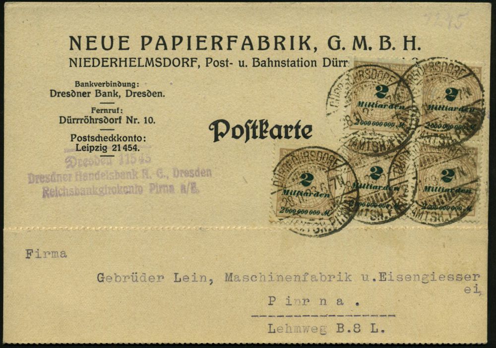 | 1082 | 20 € | WEIMARER REPUBLIK 1919 - 1932/33 : DÜRRÖHRSDORF/ AMTSH.PIRNA 1923 (28.11.) 1K-Gitter mehrfach auf MeF 2 Mia. gez. = 5 Stück, 4-fachzeit!, Endphase der Hyper-Inflation! , klar gest. Firmen-Fernkt.: NEUE PAPIERFABRIK GMBH, 3 Tage vor der Währungsreform am 1. Dezember! (Mi.326 A, MeF = 4-fach-Zeit) | | |