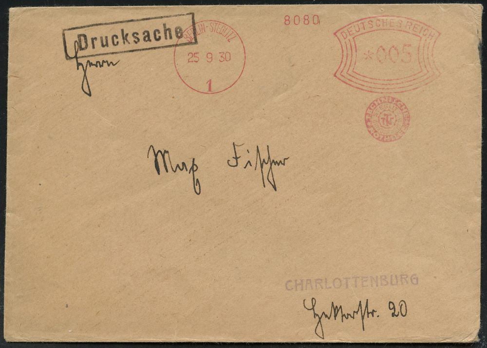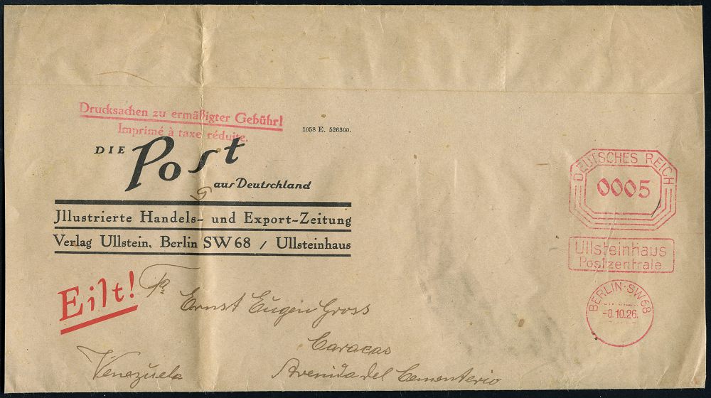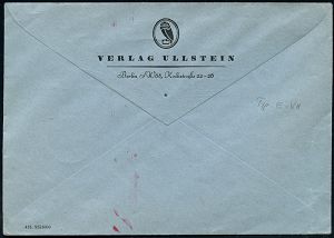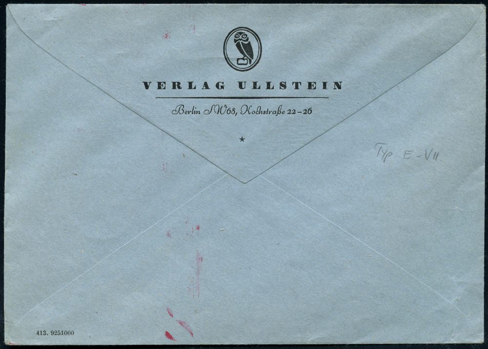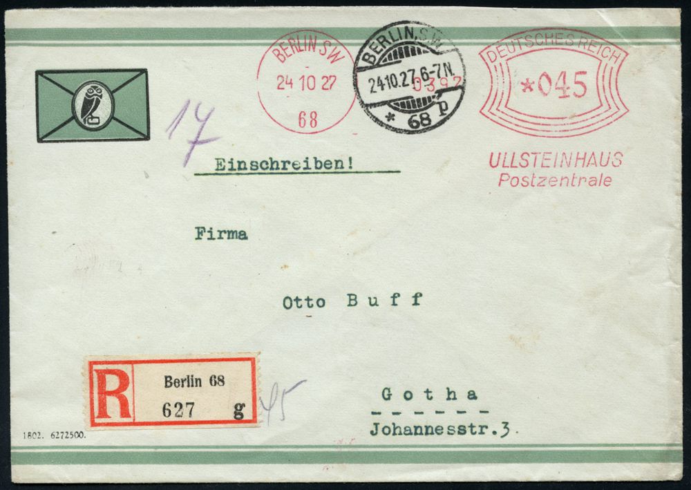 | 1044 | 25 € | WEIMARER REPUBLIK 1919 - 1932/33 : BERLIN SW/ 68/ ULLSTEIN/ Postzentrale 1927 (24.10.) AFS Francotyp "Bogenrechteck" 045 Pf. + RZ: Berlin 68/g , dekorativer, grüner Firmen-R-Bf. mit Firmenlogo (Eule) = "Die Grüne Post" (rs. Abs.-Vordruck = Zeitschrift), = jüdischer Presse-Verlag, von den Nazis "arisiert" (Dü.E-1Am) | | |