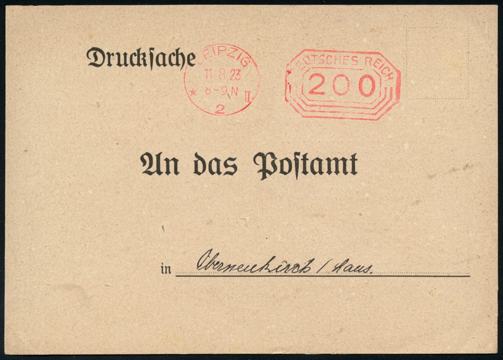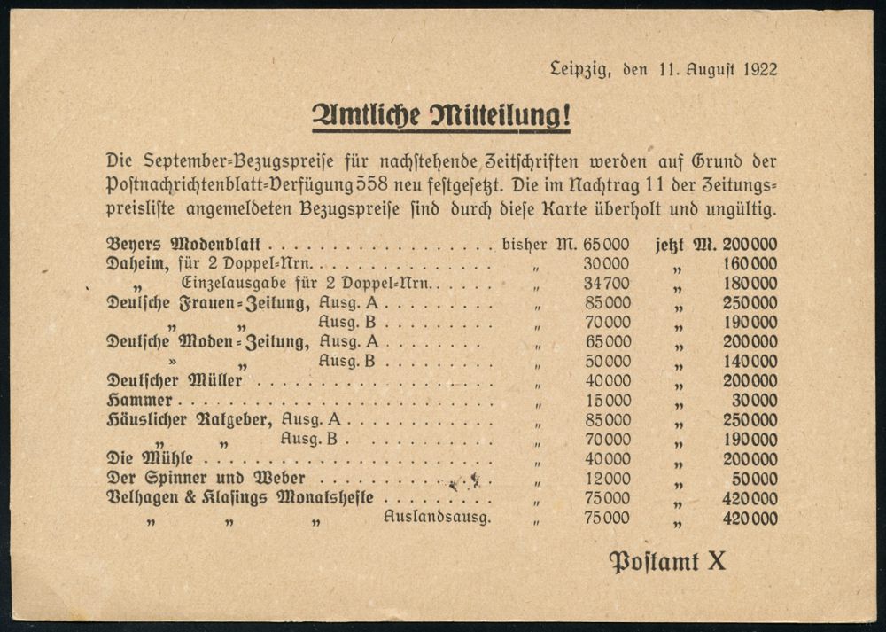| 1115 | 18 € | WEIMARER REPUBLIK 1919 - 1932/33 : LEIPZIG/ *2II/ DEUTSCHES REICH 1923 (11.8.) PFS "Achteck" 200 (Mk.) auf Mitteilungskarte über Preiserhöhungen von Zeitschriften-Bezug (für 10 verschiedene Zeitschriften) z. B. "Beyers Modenblatt" von 65.000 auf 200.000 Mk., Fern-Kt. vom Beginn der Hyper-Inflation! (Dü.D-3, Nr.62) | | |