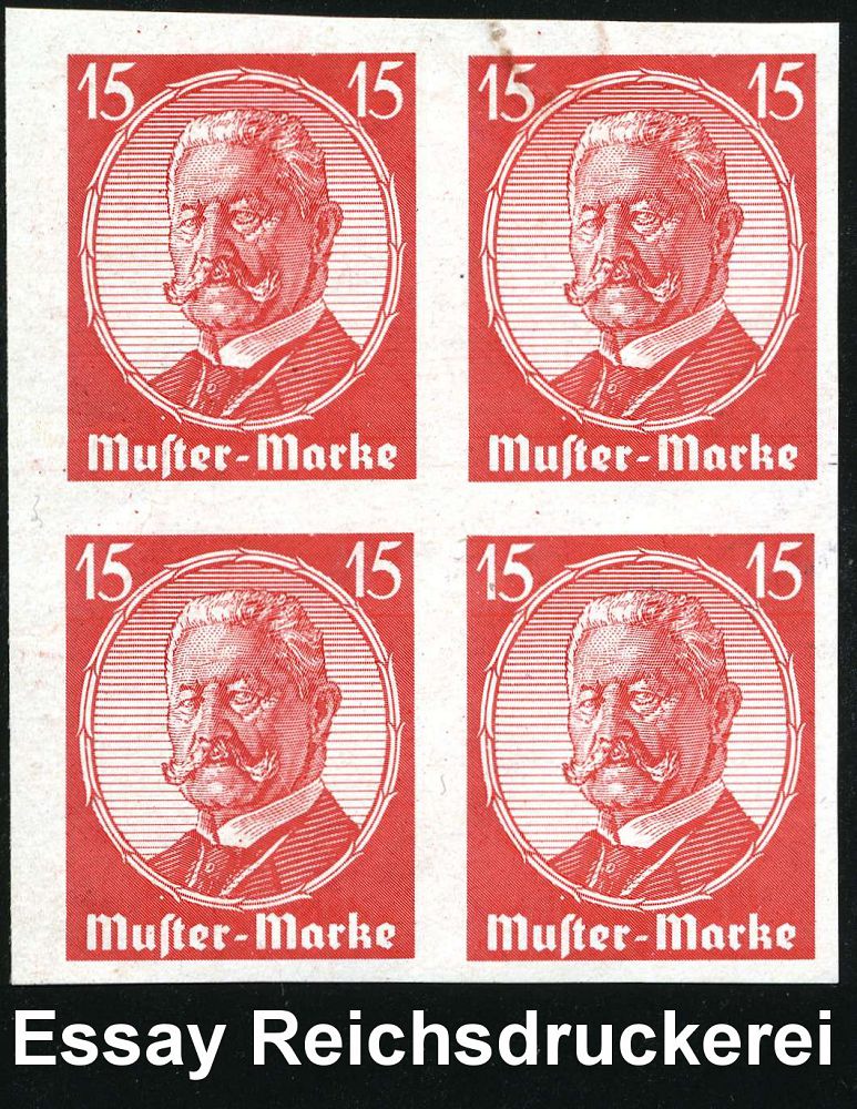 | 1157 | 90 € | WEIMARER REPUBLIK 1919 - 1932/33 : DEUTSCHES REICH 1928 15 Pf. Hindenburg., ungez. "Mustermarke", rot = Essay, ungebr. 4er-Block m. orig. G. (1 Marke rs. Rostfleckchen) + viol. Doppel-Oval: HERBST & JLLIG/FRANKFURT A.M., (Einzelausruf e i n e r Marke möglich: 35.- EUR), selten! (zu Mi.414) | | |