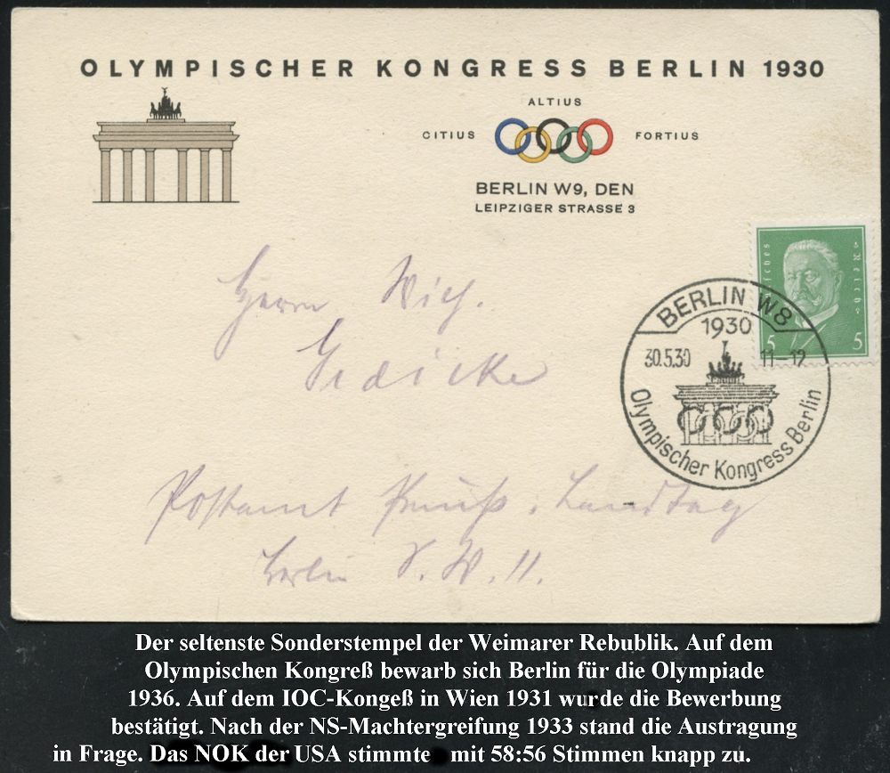 | 1054 | 900 € | WEIMARER REPUBLIK 1919 - 1932/33 : BERLIN W 8/ Olympischer Kongres Berlin 1930 (30.5.) sehr seltener SSt = Brandenbg. Tor mit olymp. Ringen, auf dem Olymp. Kongreß bewarb sich Berlin für die Spiele 1936, 1931 erhielt Berlin vom IOC in Wien den Zuschlag , nach der Machtergreifung der Nazis 1933 u. der Nürnberger Rassegesetze stand ein Boykott im Raum, vor allem der USA, dort entschied das NOK mit nur 58:56 Stimmen gegen den Boykott , sehr seltene Color-Sonderkarte mit gleichen Motiven! (Bo.117, seltenster Sonderstpl. der Weimarer Republik) | | |