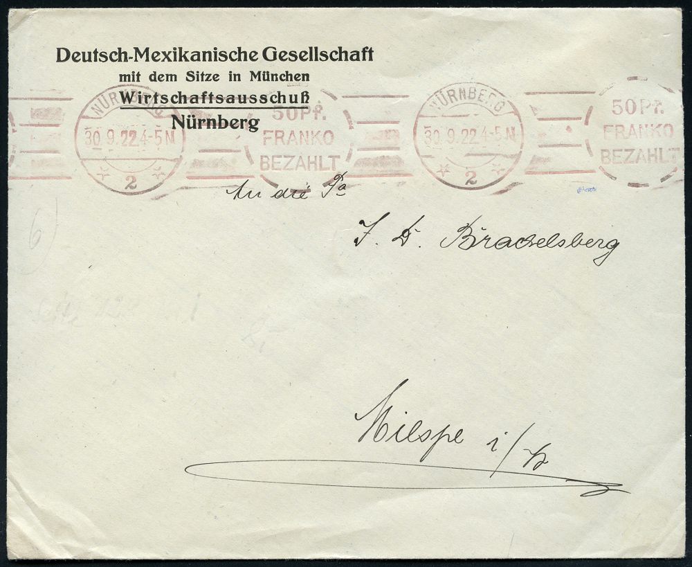 | 1133 | 25 € | WEIMARER REPUBLIK 1919 - 1932/33 : NÜRNBERG/ *2*/ 50 Pf./ FRANKO/ BEZAHLT 1922 (30.9.) rot-violetter Band-PFS 50 Pf. Typ "Sylbe & Pondorf" auf Vordr.-Bf.: Deutsche Mexikanische Gesellschaft.. Wirtschaftsausschuß, seltener Fern-Bf. (Dü.C-1, Nr.9 b) | | |