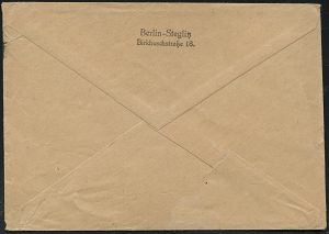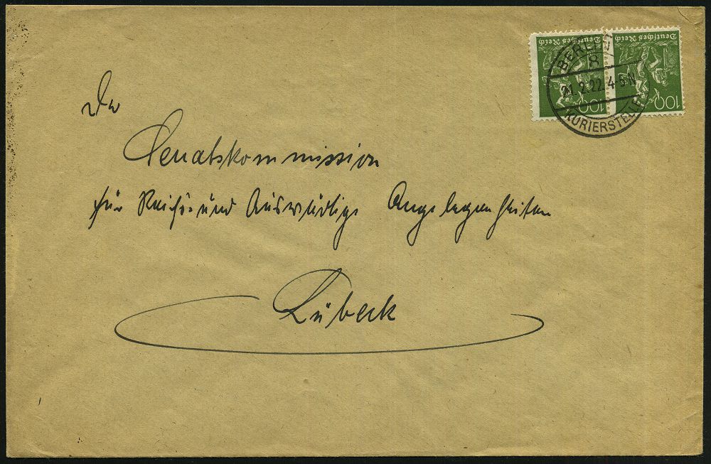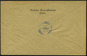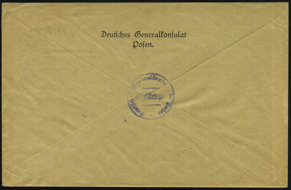 | 1022 | 65 € | WEIMARER REPUBLIK 1919 - 1932/33 : BERLIN W/ 8/ KURIERSTELLE 1922 (21.2.) seltene 1K-Brücke = Hauspostamt Auswärtiges Amt auf Paar 100 Pf. Bergarbeiter, rs. Abs.-Vordruck: Deutsches Generalkonsulat Posen + viol. 1K-Dienst-HdN = diplomat. Kurier-Brief, Auflieferung Berlin, Posen war im Aufstand von 1918-19 faktisch vor dem Versailler Vertrag durch Polen vom Deutschen Reich abgetrennt worden! (vergl. Los Nr.944), diplomat. Beziehung D.R. - Polen erst 1929 !, seltener Beleg! (Mi.167 MeF + 22.- EUR) | | |