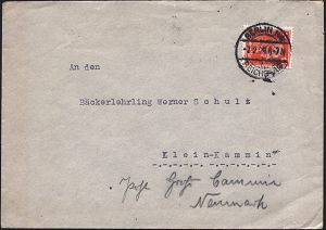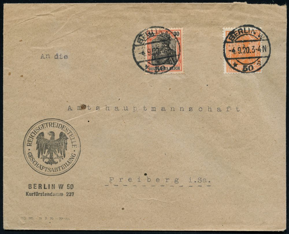 | 1019 | 18 € | WEIMARER REPUBLIK 1919 - 1932/33 : BERLIN W/ *50a 1920 (4.9.) 1K-Brücke auf Germania 30 Pg. u. 10 Pf. , Dienst-Bf.: REICHSGETREIDESTELLE, GESCHÄFTSABTEILUNG.. (Weimarer Adler, rs. Klappenmäg.) Fern-Bf. n. Freiberg/Sa. (Mi.89 II, 141) | | |