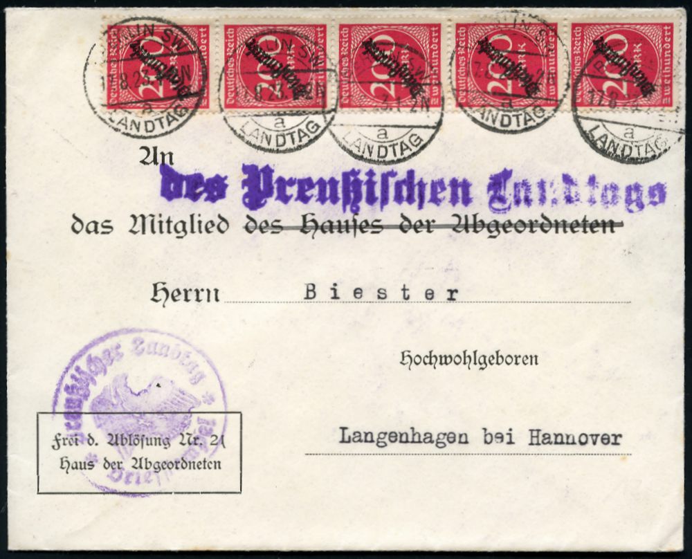 | 1030 | 60 € | WEIMARER REPUBLIK 1919 - 1932/33 : BERLIN SW/ L A N D T A G 1923 (17.8.) 1K-Brücke = Hauspostamt Berliner Abgeordnetenhaus 5x auf vertikalem 5er-Streifen 200 Mk. Dienst + viol. 1K-HdN: Deutscher Landtag (preuß. Adler) auch 1x rs., viol. Zusatz-1L: des Preußischen Landtages, seltener Fern-Dienst-Bf. der Hoch-Inflation! (Mi.D 78 MeF) | | |