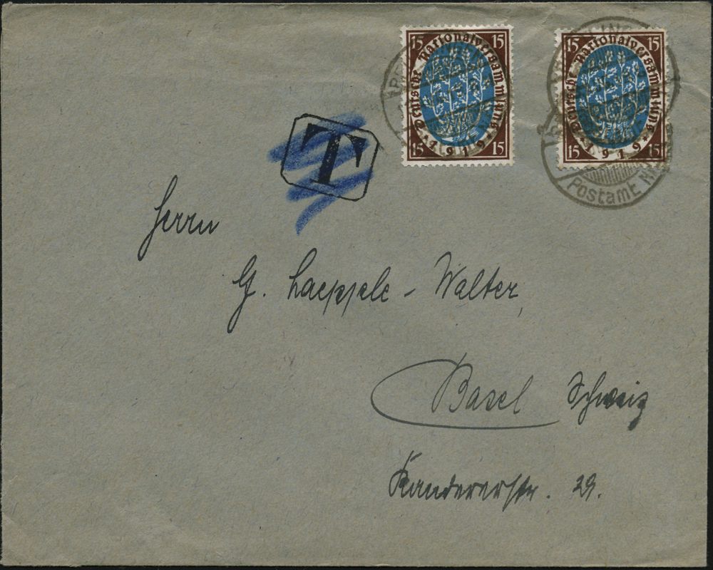 | 1154 | 18 € | WEIMARER REPUBLIK 1919 - 1932/33 : DEUTSCHES REICH 1919 (13.8.) 15 Pf. Nat.-Vers., reine MeF (2) als unzulässige Ausl.-Frankatatur , 1K-Steg: REUTLINGEN/ Postamt Nr. 1 + schw."T"ax-Ra. (blau durchgestrichen) war nur im Inland gültig! (da kein Landesname!) unbeanstandeter Ausl.-Bf. n. Basel! (Mi.108 MeF) | | |