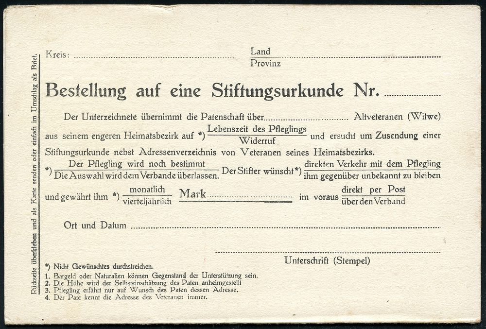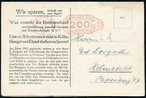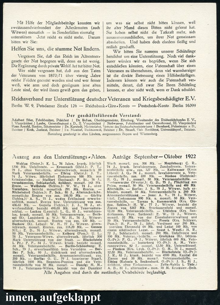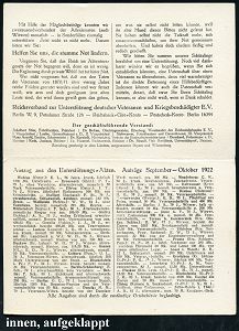 | 1025 | 20 € | WEIMARER REPUBLIK 1919 - 1932/33 : BERLIN W/ *8II/ DEUTSCHES REICH 1922 (14.12.) PFS "Achteck" 200 (Pf.) auf Klapp-Kt.: Reichsverband deutscher Veteranen u. Kriegsbeschädigter E.V. mit Spendenaufruf (Bestellung einer Stifterurkunde) etc. (Dü.D-3, Nr.32) | | |