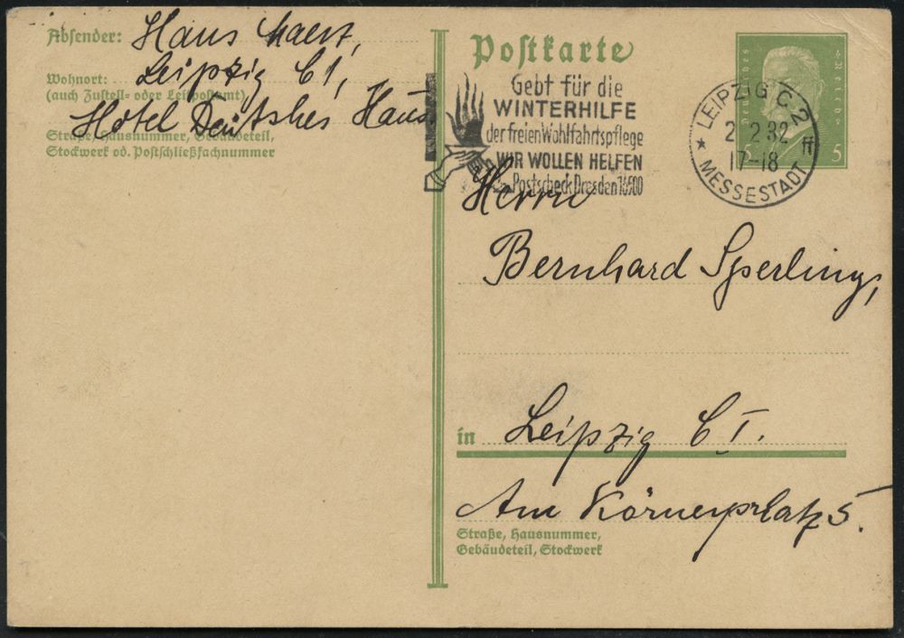 | 1120 | 18 € | WEIMARER REPUBLIK 1919 - 1932/33 : LEIPZIG C2/ *ff/ MESSESTADT/ Gebt für die/ WINTERHILFE/ d.freien Wohlfahrt.. 1932 (2.2.) seltener MWSt = WHW-Vorläufer! ( 2Hände, Flammenschale) Bedarfs-Orts-Kt. (Bo.S 128 A , nur 2 Monate in 6 Orten verwendet!) | | |