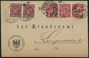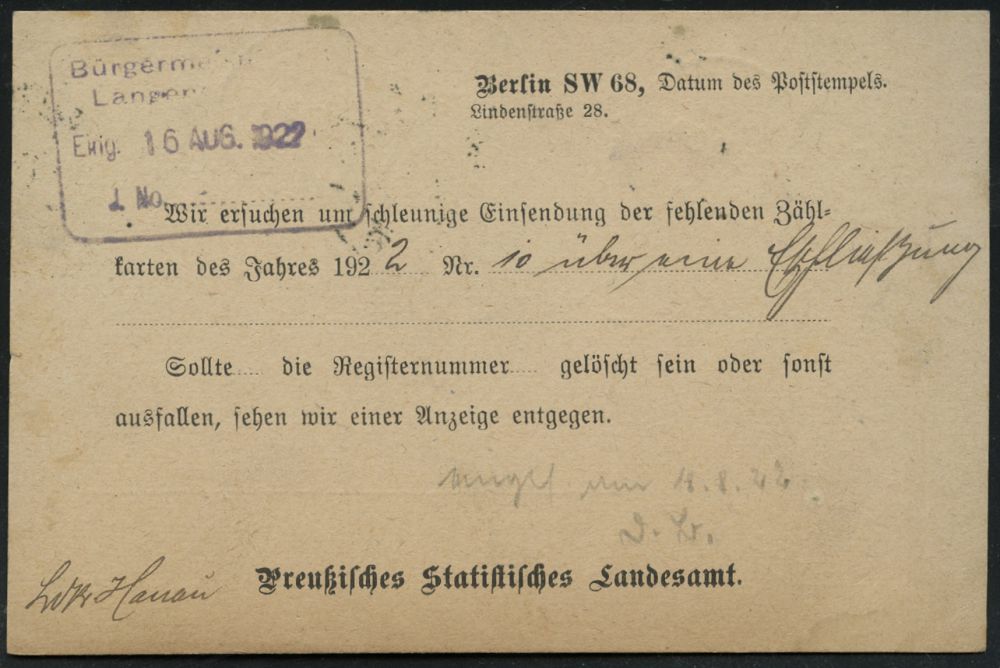 | 1024 | 15 € | WEIMARER REPUBLIK 1919 - 1932/33 : BERLIN SW/ *68r 1923 (15.8.) 1K-Brücje 4x auf Dienst-Frankatur auf Dienst-Kt: PREUSS.STATIST. LANDESAMT = Mahnung für statistische Ehe-Daten ! | | |