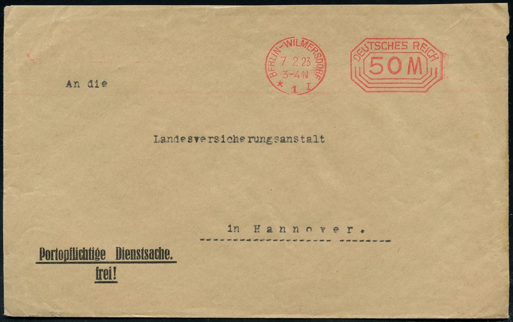 | 1026 | 18 € | WEIMARER REPUBLIK 1919 - 1932/33 : BERLIN-WILMERSDORF/ *1I/ DEUTSCHES REICH 1923 (7.2.) Infla-PFS "Achteck" 50 M. (ark) auf Dienst-Fern-Bf.: Reichsversicherungsanstalt für Angestellte, rs. Abs.-Vordruck (Dü.D-3, Nr.52) | | |