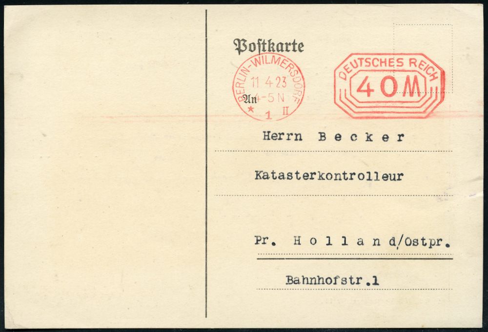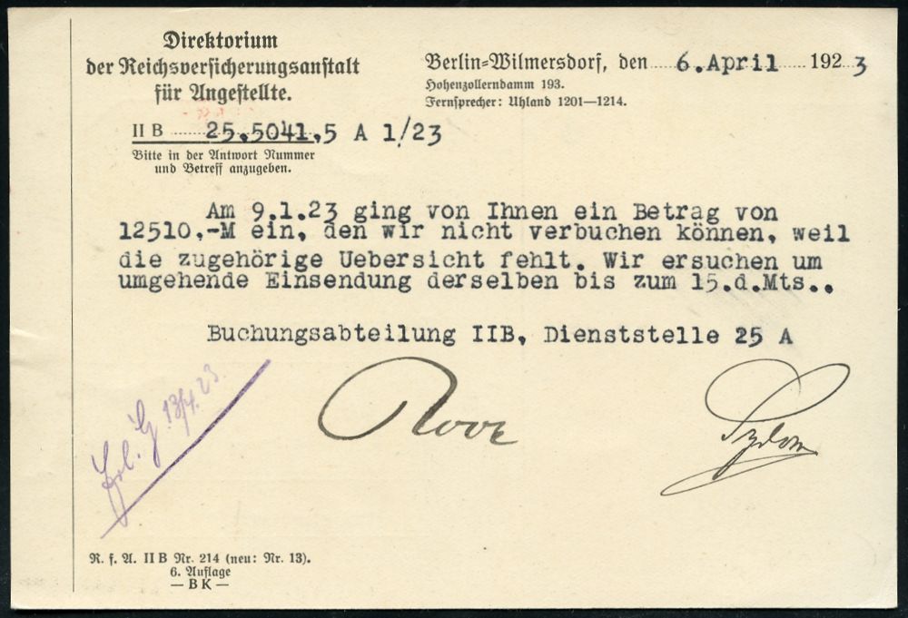 | 1027 | 16 € | WEIMARER REPUBLIK 1919 - 1932/33 : BERLIN-WILMERSDORF/ *1II/ DEUTSCHES REICH 1923 (11.4.) Infla-PFS "Achteck" 40 M. (ark) auf Dienst-Kt.: Reichsversicherungsanstalt für Angestellte betr. nicht buchbare Einzahlung (Dü.D-3, Nr.50) | | |