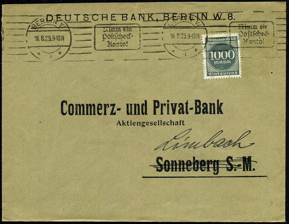 | 1028 | 16 € | WEIMARER REPUBLIK 1919 - 1932/33 : BERLIN W/ *8*/ Nimm ein/ Postscheck=/ Konto! 1923 (16.8.) seltener Band-MWSt (6 Striche zw. den Stempeln) auf EF 1000 Mk. auf Firmen-Bf.: DEUTSCHE BANK, BERLIN W 8 , Fern-Bf. an Commerz-Bank, interess. Kombination! (Bo.68 Bd I , nur 19223-24) | | |