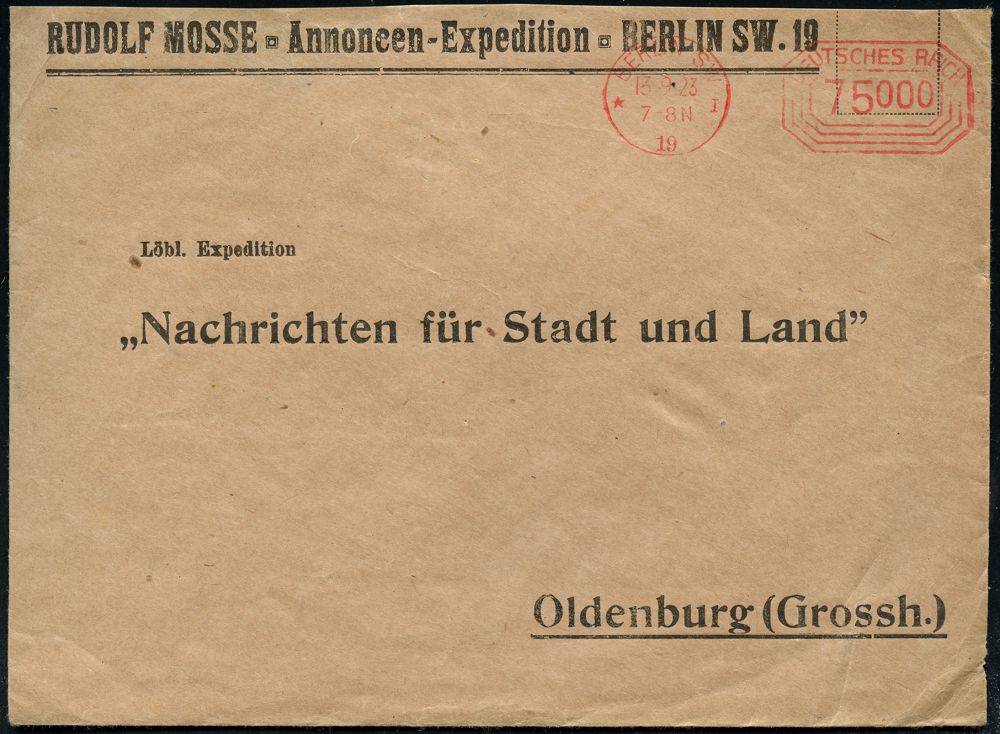 | 1031 | 20 € | WEIMARER REPUBLIK 1919 - 1932/33 : BERLIN SW/ *19I/ DEUTSCHES REICH 1923 (13.9.) Infla-PFS "Achteck" 75000 (Mark) auf Firmen-Bf.: RUDOLF MOSSE; Annoncen-Expedition.. (rs. Klappenausriß) n. Oldenbg. = jüdischer Presse-Konzern (Dü.D-3, Nr.105) | | |