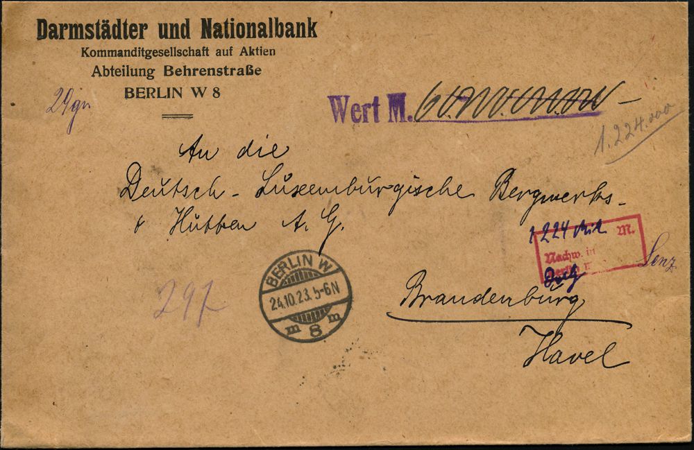 | 1033 | 28 € | WEIMARER REPUBLIK 1919 - 1932/33 : BERLIN W/ m 8 m 1923 (24.10.) 1K-Gitter + roter Ra3: ...M./nachw. in/Berlin W.8 + hs. "1224 Mill." + hs. Wertangabe "60.000.000.000.-" Mk., Firmenbrief: DaNat-Bank (rs. Klappenmäng.) Hoch-Inflation!1,2 Billionen Porto!, Fern-Wert-Bf. n. Brandenbg./Havel (Mi.Spez. + 60.- EUR) | | |