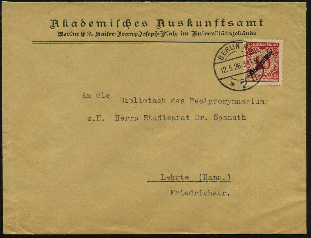 | 1036 | 15 € | WEIMARER REPUBLIK 1919 - 1932/33 : BERLIN NW/ *7ii 1926 (12.5.) 1K-Brücke auf EF 10 Pf. Dienst, Dienst-Bf.: Akademisches Auskunftsamt..Universitätsgebäude (rs. Siegeldruck, preuß Adler) Fernbf. (Mi.D 101 EF) | | |