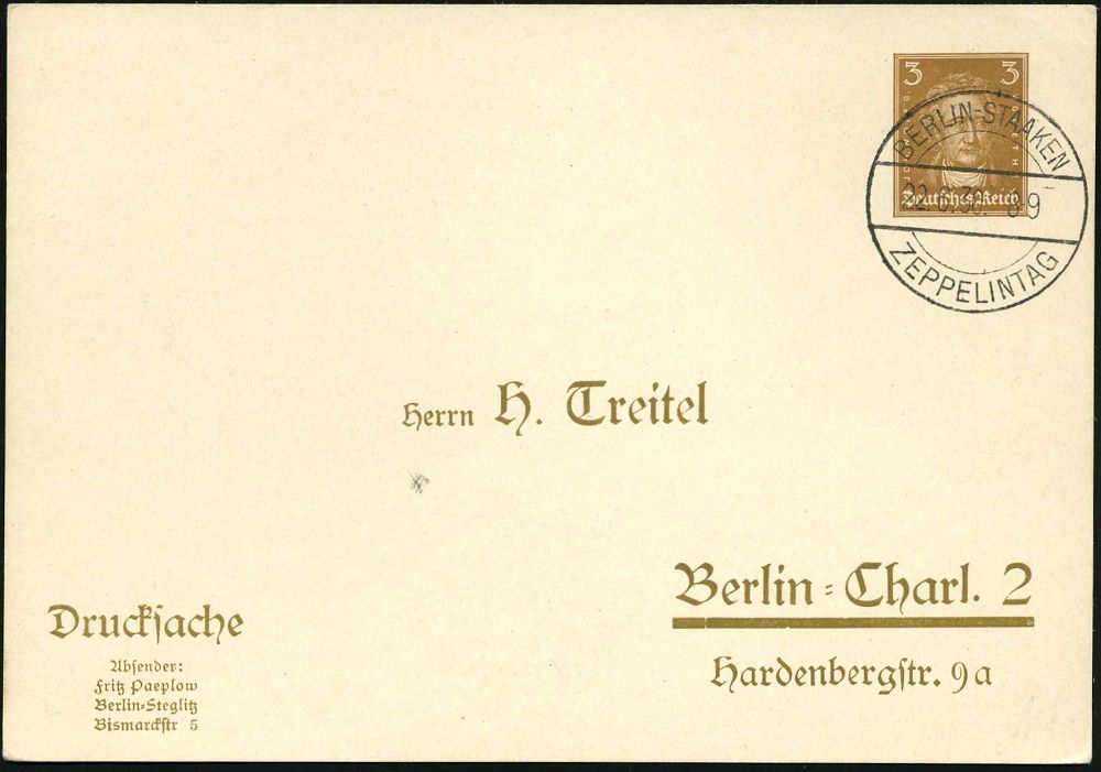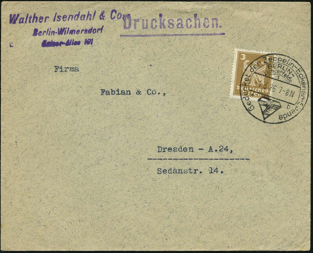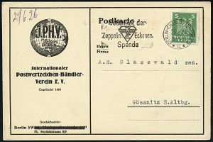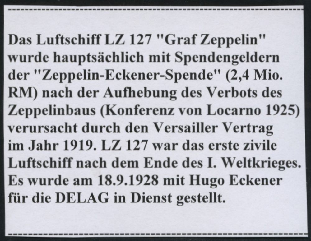| 1038 | 25 € | WEIMARER REPUBLIK 1919 - 1932/33 : BERLIN-CHARLOTTENBURG 2/ *u*/ Gedenket der/ Zeppelin-Eckener-/ Spende 1926 (23.6.) MWSt mit UB "u" = Zepp.-Eckener-Logo, lt. Versailer Vertrag war Deutschland der Bau von Luftschiffen verboten, das Verbot wurde im Vertrag von Locarno (1925) aufgehoben, die Zeppelin-Eckener-Spende brachte 2,4 Mio. RM für den Bau des Luftschiffes "Graf Zeppelin" (LZ 127) Indienststellung mit Hugo Eckener am 18.9.1928, klar gest. Vordruck-Kt.: J.P.H.V. (Bo.88 A , nur bis Mitte 1926 verwendet!) | | |