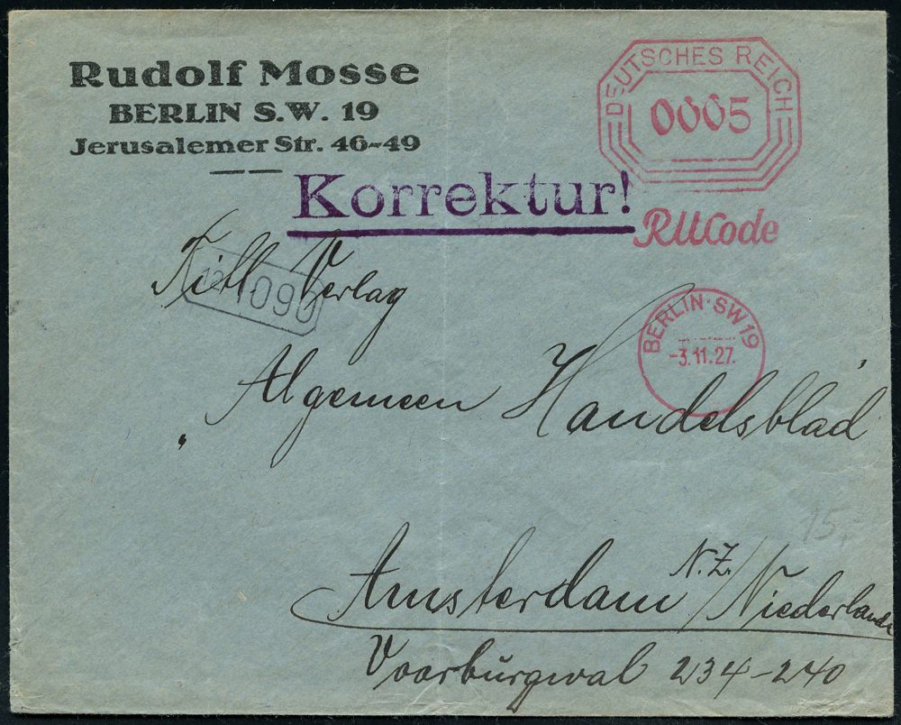| 1045 | 25 € | WEIMARER REPUBLIK 1919 - 1932/33 : BERLIN SW 19/ RM Code 1927 (3.11.) AFS-Vorläufer "Bafra" mit Vertikalaches, vierstellig 0005 Pf. + viol. 1L: Korrektur!, Firmen-Aul.-Drs.-Bf. (schwache Mittelfalte) n. Amsterdam (Dü.E-VIII, Nr.35 c) | | |