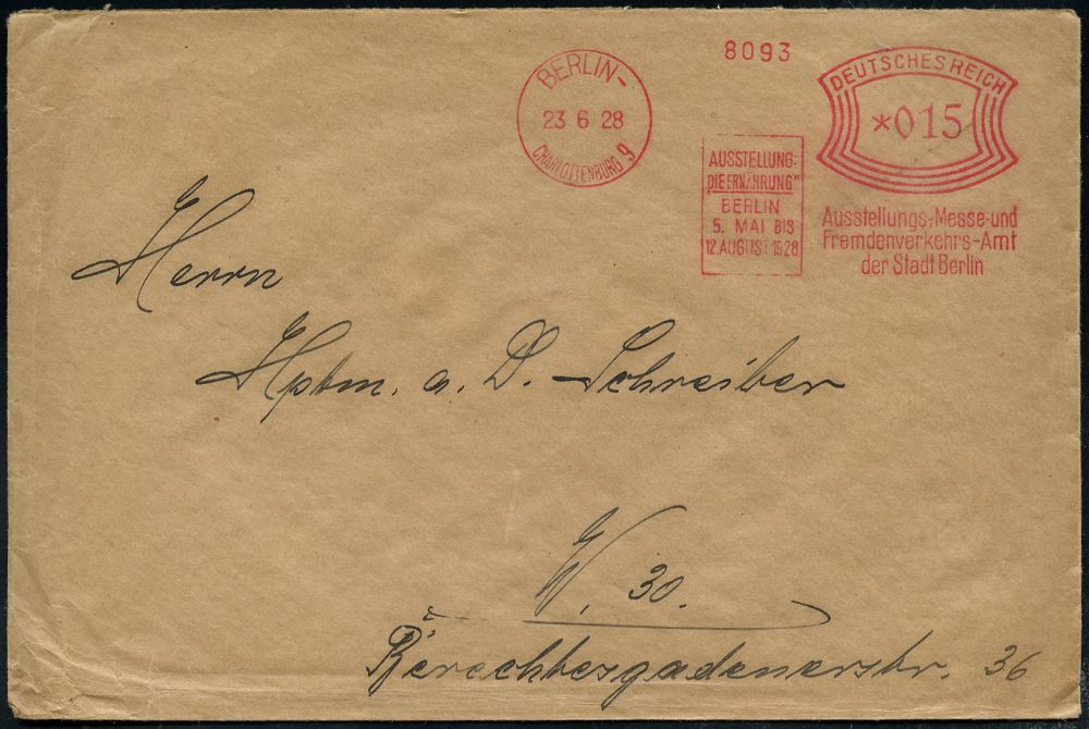 | 1048 | 35 € | WEIMARER REPUBLIK 1919 - 1932/33 : BERLIN-/ CHARLOTTENBG.9/ AUSSTELLUNG/ "DIE ERNÄHRUNG"/ 5.MAI BIS/ 12.AUG.1928/ Ausstellungs-,Messe-u./ Fremdenverkehrs-Amt 1928 (23.6.) seltener AFS Francotyp "Bogenrechteck" klar auf Orts-Bf., (Dü.E-1Ah, nur kurze Verwendungszeit) | | |