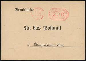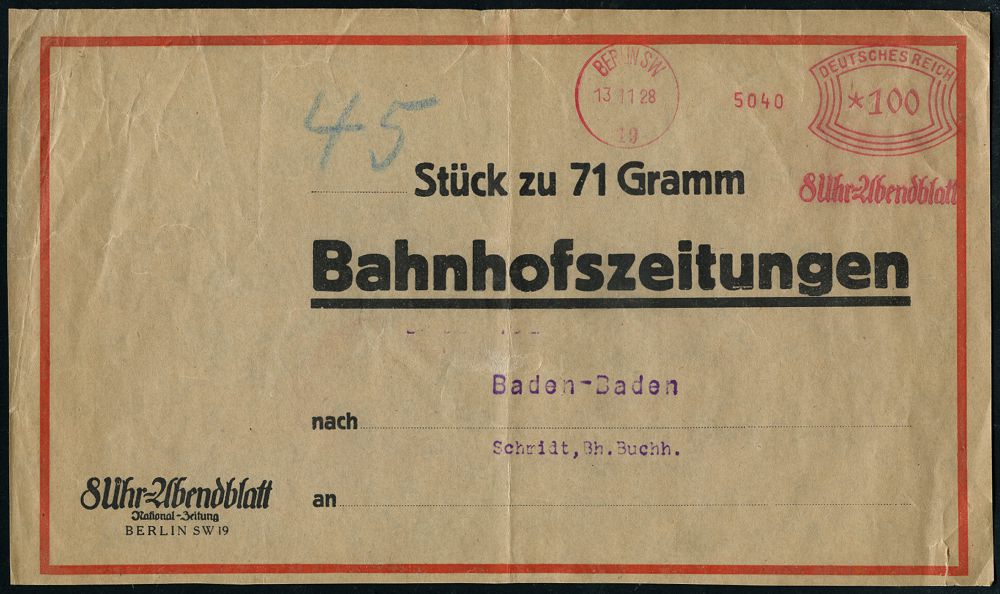 | 1049 | 40 € | WEIMARER REPUBLIK 1919 - 1932/33 : BERLIN SW/ 19/ 8 Uhr-Abendblatt 1928 (13.11.) AFS Francotyp "Bogenrechteck" *100 Pf. auf Vorbindezettel: Bahnhofszeitungen.. 8 Uhr-Abendblatt (1x kl. Riß) für Zeitschriften nach Baden-Baden, sehr seltene Portostufe! (Dü.E-1Ah) | | |