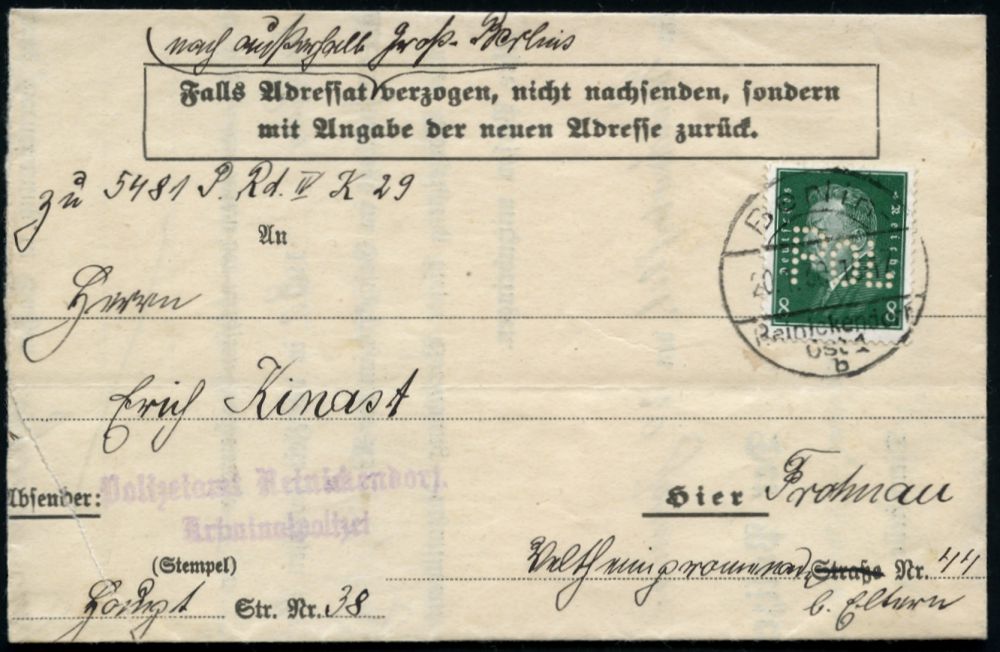 | 1053 | 16 € | WEIMARER REPUBLIK 1919 - 1932/33 : Berlin-/ Reinickendorf/ Ost 1/ b 1930 (20.1.) 1K-Brücke auf EF 8 Pf. Ebert mit amtl. P O L - Lochung + viol. 2L: Polizeiamt Reinickendorf/ Kriminalpolizei, (Teil)-Faltbf. (innen Riß geschl.) = Vorladung zur Vernehmung (Mi.412 , EF Perfin) | | |