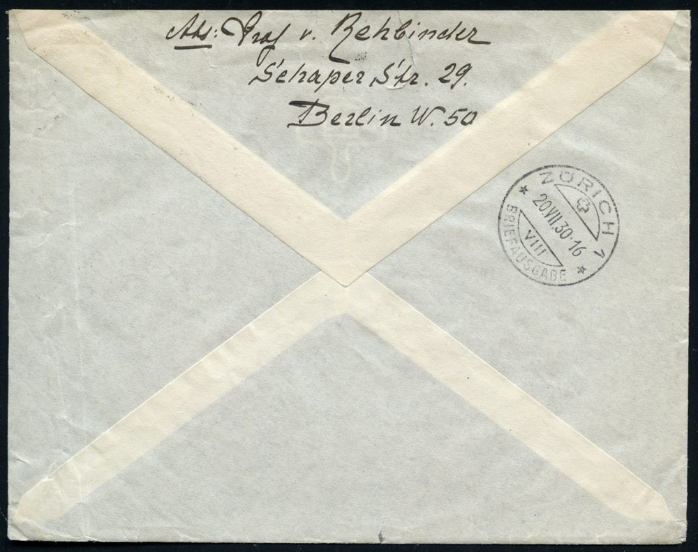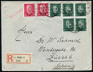 | 1057 | 40 € | WEIMARER REPUBLIK 1919 - 1932/33 : BERLIN W/ * 9 m 1930 (19.7.) 2x überkompl. Satz Ebert-Hindenburg mit Aufdruck "30. JUNI 1930" = Datum des Abzugs alliierter Besatzungstruppen aus dem Rheinland (5x 8 Pf., 2x 15 Pf.) + RZ: Berlin 9/f (minim. Rißchen), rs. hs. eigenhändiger Abs.: "Graf v. Rehbinder" (1879 - 1957) Deutsche Zentrumspartei, Mitglied des 2. Reichstages etc., klar gest. Ausl.-R-Bf. n. Zürich (Mi.5x 444, 2x 445) | | |