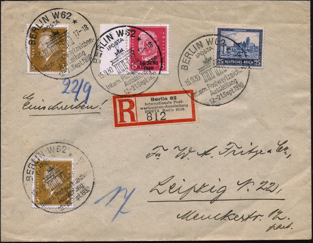 | 1058 | 35 € | WEIMARER REPUBLIK 1919 - 1932/33 : BERLIN W 62/ */ IPOSTA/ Intern.Postwertzeichen-/ Ausstellung 1930 (15.9.) SSt = Brandenbg. Tor 4x + Sonder-RZ: Berlin 62/ Internationale Post-/wertzeichen-Ausstellung/ IPOSTA Berlin 1930, dekorativer Fern-R-Bf. (Bo.122 Ty.I = *) | | |