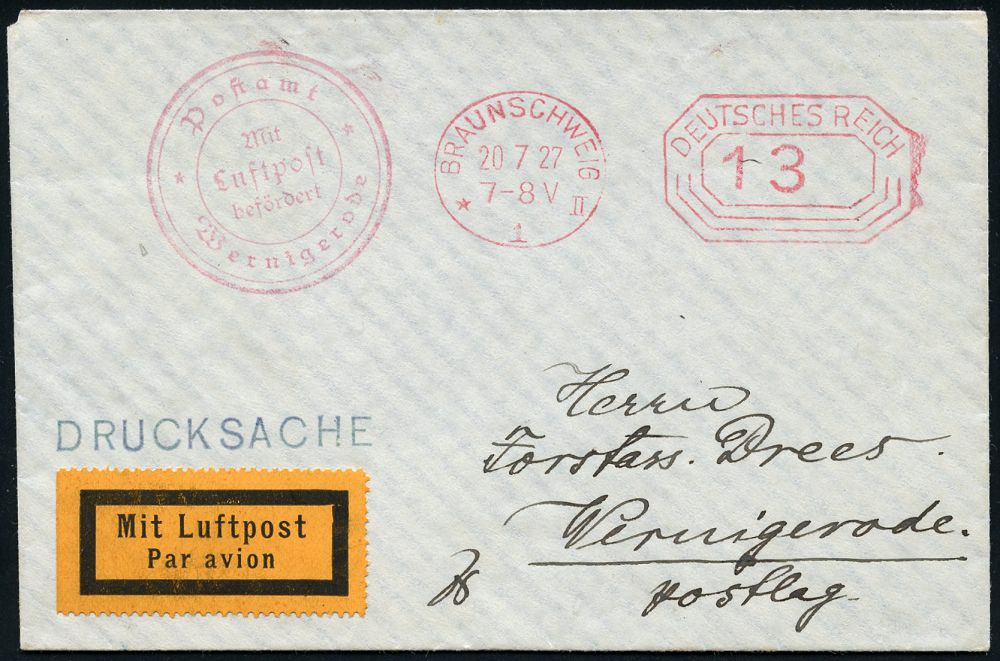 | 1067 | 30 € | WEIMARER REPUBLIK 1919 - 1932/33 : BRAUNSCHWEIG/ *1II/ DEUTSCHES REICH 1927 (20.7.) PFS "Achteck" 13 Pf. + roter 3K-HdN: Mit/Luftpost/befördert/ Postamt/Wernigerode (Mi.F 108, + 32.- EUR) + orange Flp.-Label, kleiner seltener Flp.-Inl.-Bf. n. Wernigerode (Mi.27.29-02 + 22.- EUR) | | |