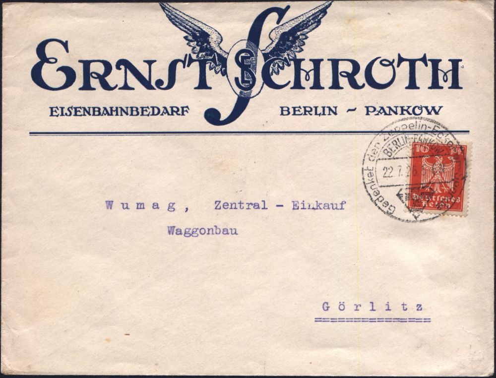 | 1039 | 25 € | WEIMARER REPUBLIK 1919 - 1932/33 : BERLIN-PANKOW/ Gedenket der Zeppelin-Eckener-Spende 1926 (22.7.) seltener HWSt = Zeppelin-Eckener-Logo, lt. Versailler Vertrag war Deutschland der Bau von Luftschiffen verboten, das Verbot wurde im Vertrag von Locarno (1925) aufgehoben, die Zeppelin-Eckener-Spende brachte 2,4 Mio. RM für den Bau des Luftschiffs "Graf Zeppelin" (LZ 127) Indienststellung mit Hugo Eckerner am 18.9.1928, klar gest. Firmen-Bf.: Ernst Schroth, Eisenbahnbedarf.. (Bo.83 III, nur Mitte 1925 - Mitte 1926) | | |