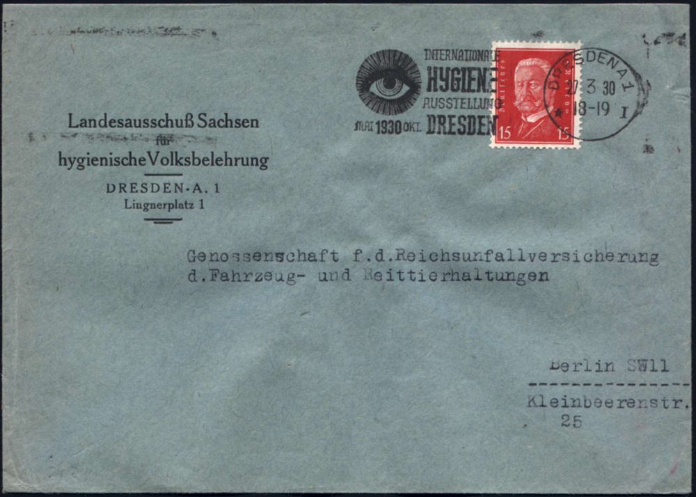 | 1076 | 30 € | WEIMARER REPUBLIK 1919 - 1932/33 : DRESDEN A1/ *I/ INTERNAT./ HYGIENE/ AUSSTELLUNG 1930 (27.3.) MWSt = Auge (Pupille mit Ringen) + rs. motivgl. amtl. Ausstellungs-Vignette (Auge) Vordruck-Bf.: Landesausschuß Sachsen für hygienische Volksbelehrung, sehr seltene Kombination! (Bo.60 A I) | | |