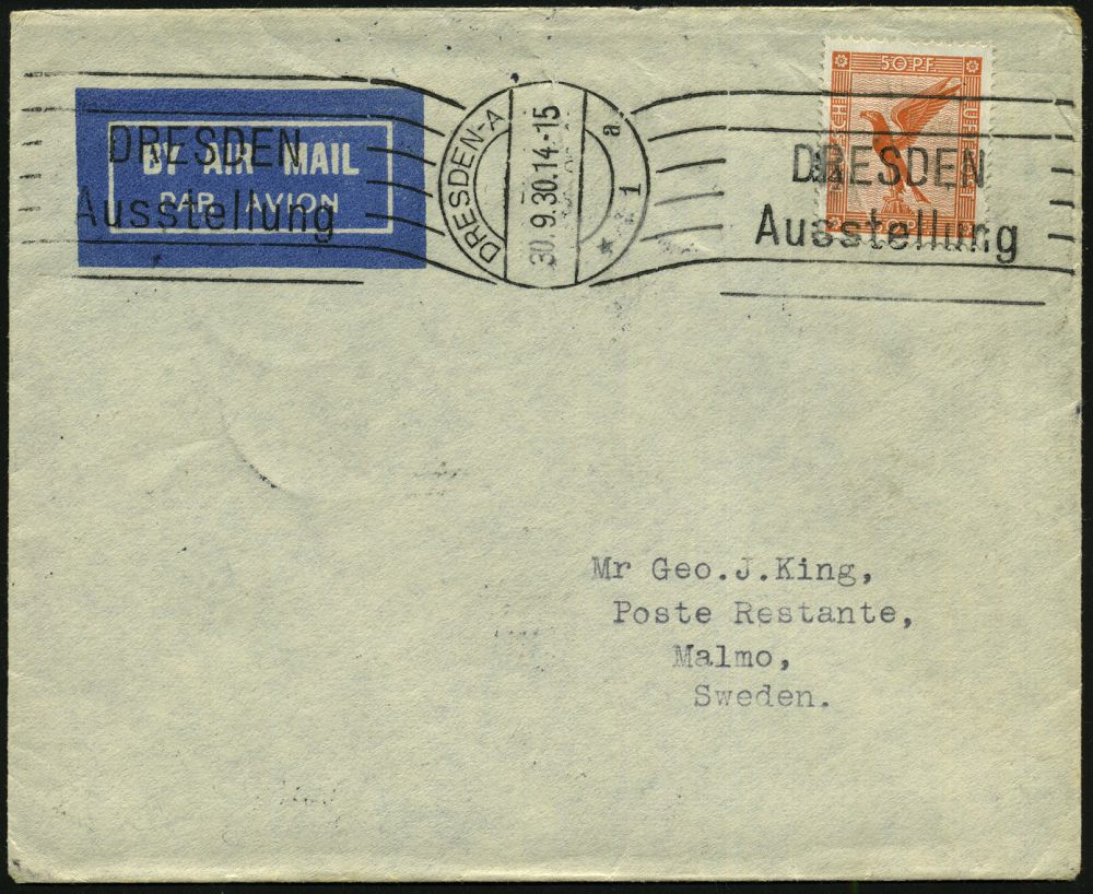 | 1078 | 30 € | WEIMARER REPUBLIK 1919 - 1932/33 : DRESDEN.A/ *1a/ DRESDEN/ Ausstellung 1930 (30.9.) seltener Roll-WellenSt = Deutsche Hygiene-Ausstellung auf EF 50 Pf. Adler Adler (Mi.381 EF + 40.- EUR) klar gest. Europa-Luftpost-Bf. , rs. AS Malmö etc. (Bo.55 Ro) | | |