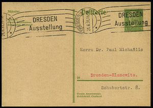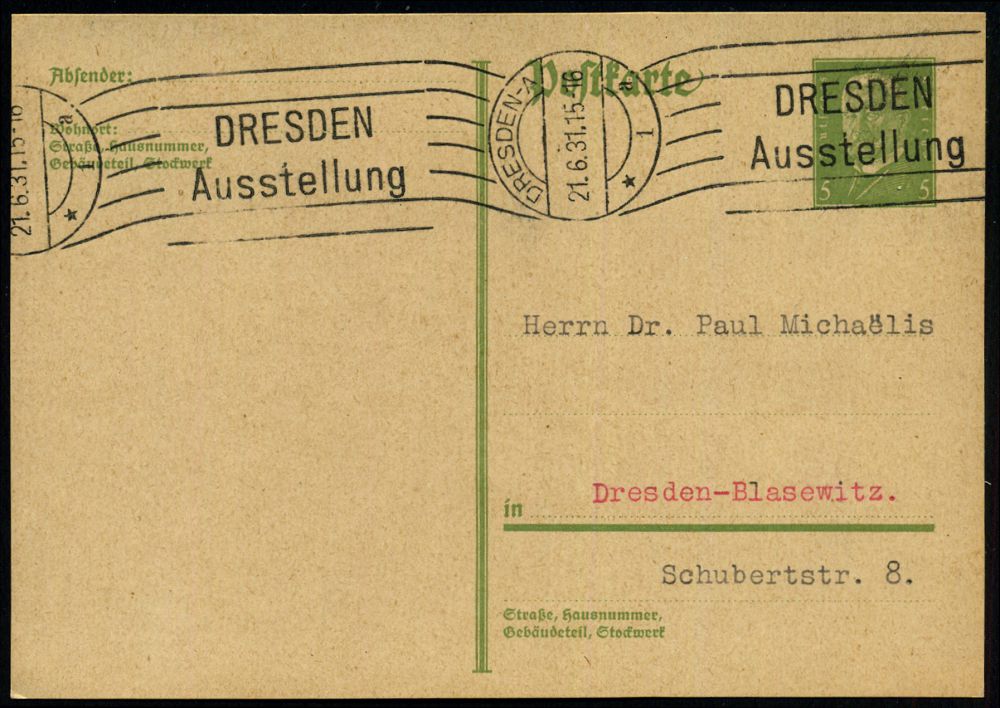 | 1080 | 20 € | WEIMARER REPUBLIK 1919 - 1932/33 : DRESDEN-A/ *1*/ DRESDEN/ Ausstellung 1931 (21.6.) seltener Roll-WwellenSt. = Saison-Hauspostamt Ausstellungsgelände , klar gest. Orts-Karte = Verwendung zur Internat. Hygiene-Ausstellung 1931 + Ausstellungs-Faksimile-Foto (Bo.55 Ro) | | |