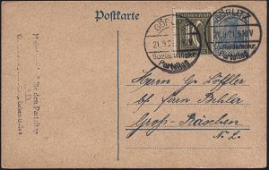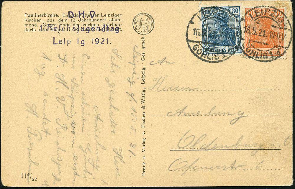 | 1109 | 25 € | WEIMARER REPUBLIK 1919 - 1932/33 : LEIPZIG-/ GOHLIS 1/ x 1921 (16.5.) 1K-Brücke auf.Germania 10 u. 30 Pf. + seltener viol. HdN (3L): D H V / 1. Reichsjugendtag/ Leipzig 1921 = Gewerkschaftsjugend Deutscher Handlungsgehilfen-Verband, seltene Fern-Ak. m. entspr. Text! (Mi.141, 144) | | |