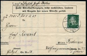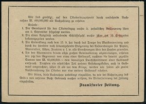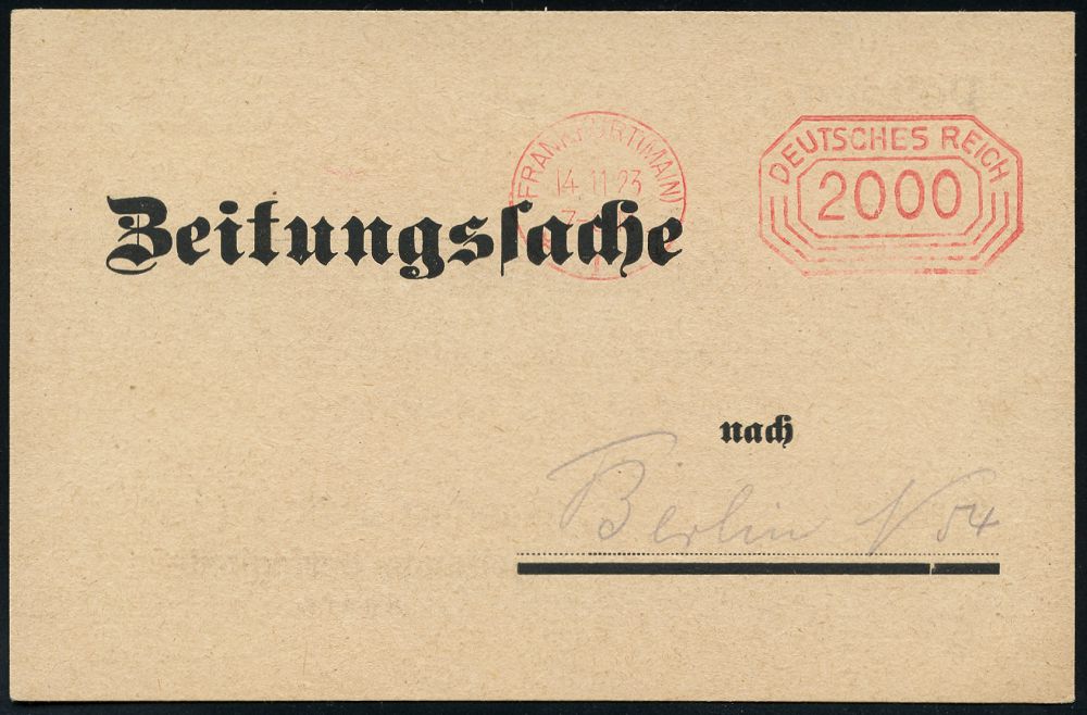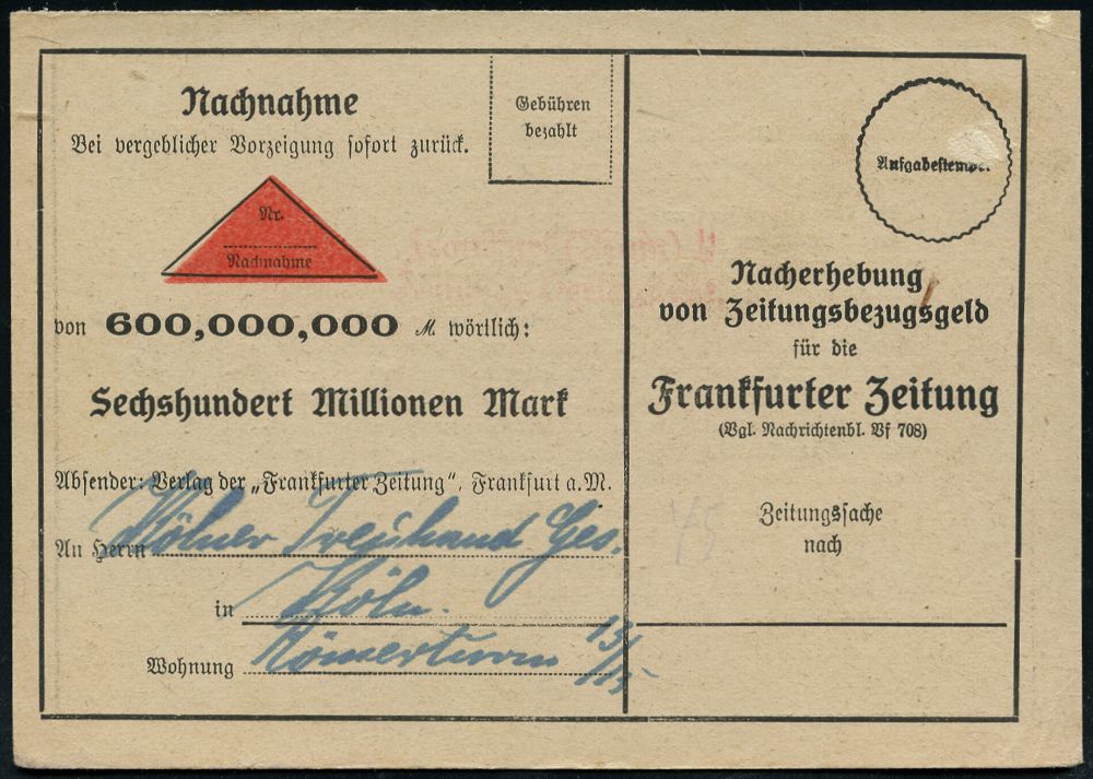 | 1086 | 25 € | WEIMARER REPUBLIK 1919 - 1932/33 : Frankfurt/ Main 1923 (Okt.) Vordruck-NN-Kt."Nacherhebung von Zeitungsbezugsgeld" über 600 Millionen Mark , seltene Orts-Karte | | |