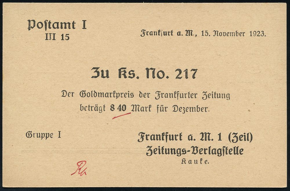 | 1087 | 25 € | WEIMARER REPUBLIK 1919 - 1932/33 : FRANKFURT (MAIN)*1I/ DEUTSCHES REICH 1923 (14.11.) Infla-PFS "Achteck" 2000 = 2 Milliarden (Mark) auf Zeitungs-Bezieher-Orts-Kt. für die Frankfurter Zeitung in Goldmark ! (Dü.D-3, Nr.169) | | |