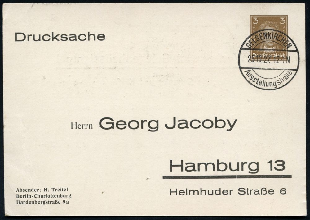 | 1090 | 18 € | WEIMARER REPUBLIK 1919 - 1932/33 : GELSENKIRCHEN/ Ausstellungshalle 1927 (25.10.) seltener SSt = Große Polizei- u. Verkehrs-Ausstellung glasklar auf PP 3 Pf. Goethe (Georg Jacoby, Frech.PP 97/B 5-02) Inl.-Karte, (Bo.1 , II. Verwendung) | | |