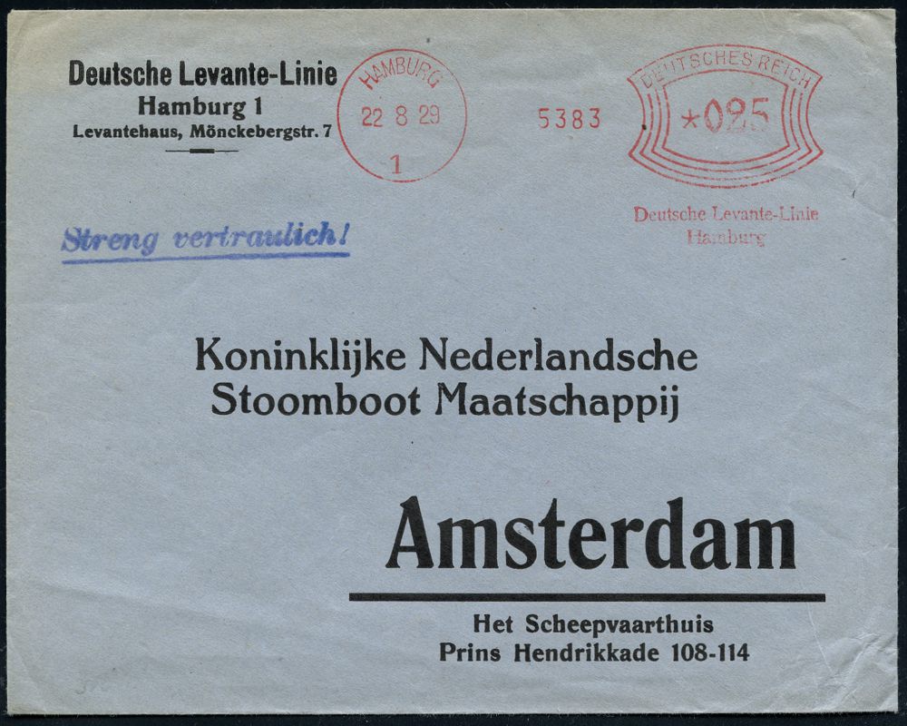 | 1098 | 18 € | WEIMARER REPUBLIK 1919 - 1932/33 : HAMBURG/ 1/ Deutsche Levante-Linie 1929 (22.8.) AFS Francotyp "Bogenrechteck" 025 Pf. auf Ausl.-Firmen-Bf.: Deutsche Levante-Linie, Levantehaus n. Amsterdam (Dü.E-1Am) | | |