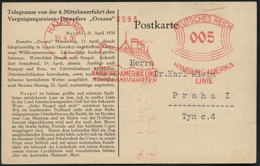 | 1100 | 25 € | WEIMARER REPUBLIK 1919 - 1932/33 : HAMBURG/ 1/ HAMBURG-AMERIKA LINIE/ NORDLANDFAHRTEN/ HAL 1930 (22.4.) AFS Francotyp "Bogenrechteck" (Fahrgast-Dampfer) auf seltener Hapag-Telegramm-Ak.: 4. Mittelmeerfahrt Dampfer "Oceana", Etappe Neapel (Napoleon-Denkmal, Ajaccio) Ausl.-Karte n. Prag! (Dü.E-1BAh) | | |